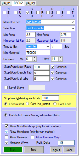 Stop@Loss each Tab: This is the important tab, as it controls the losses, as we are laying, you need to be mindful of the amount you put in here. If you are laying high price horses the Stop amount needs to be low.