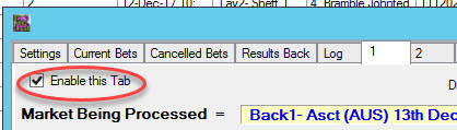 Stop@profit each Tab: This relates to the tabs at the top of the software that manages the staking, so in the example we are saying after 5 (pounds or whatever currency your betfair account is in) the staking will restart after 5 profit is make, and the tick means to continue.