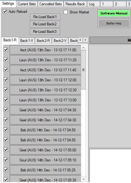 Show Market: best left unticked as it uses data from Betfair and if you use it all the time you run the rish of data charges, and there is no need to have the markets showing as the bot bets with this option ticked.